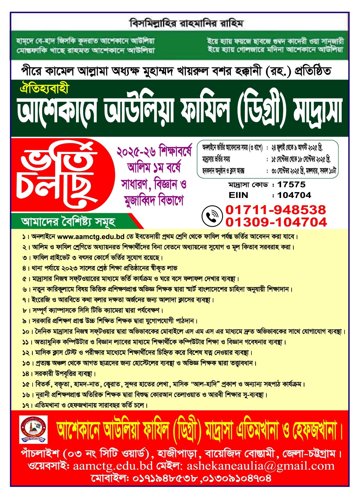 ইবতেদায়ী নার্সারী থেকে দাখিল নবম শ্রেণি পর্যন্ত বার্ষিক ও দাখিল শ্রেণির দশম শ্রেণির নির্বাচনী ২০২৫ আগামি ২০/১১/২ |